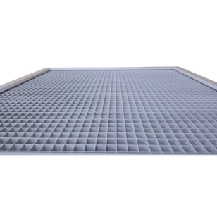 Egg crate grilles consist of two primary components: an extruded aluminium frame and aluminium cube cores measuring 12.5 mm × 12.5 mm × 12.5 mm. The cores are securely fixed within a specially designed frame, and the frame corners are reinforced with crimped flat keys to ensure a robust and durable assembly.